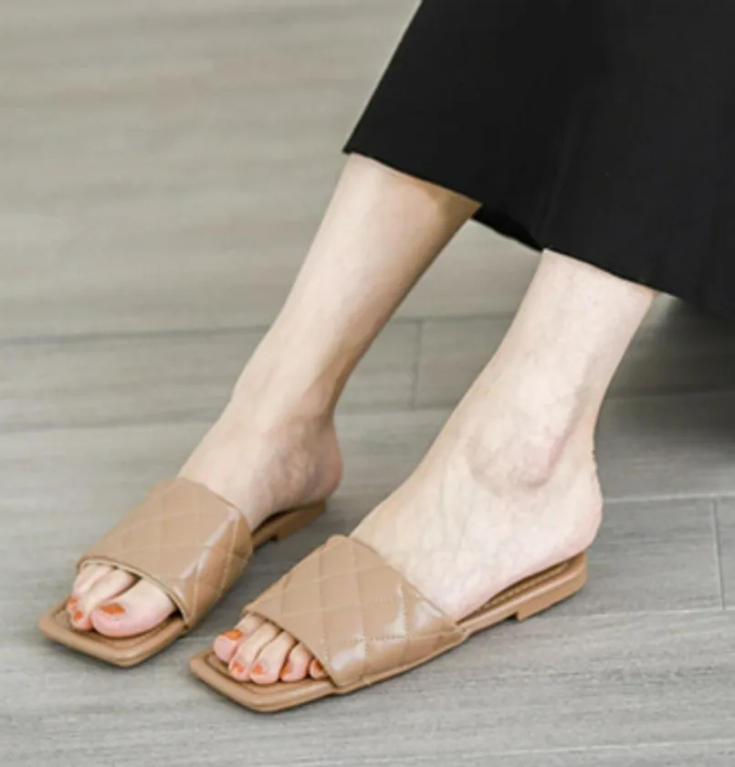 今季のトレンドであるスクエアトゥと、今年の秋のトレンドと予測されているキルティング素材で、これからにピッタリのお洒落サンダル。クッション性があり、ミュールなのに長時間の着用も辛くないという優れものです。