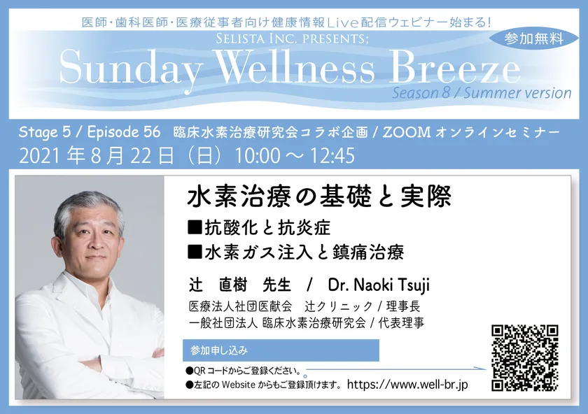 《医師・歯科医師・薬剤師向け無料Liveオンラインセミナー》 2021年8月22日(日)開催『水素治療の基礎と実際: 抗酸化と抗炎症~水素ガス注入と鎮痛治療』 講師:辻直樹先生(医療法人社団医献会 辻クリニック / 理事長、一般社団法人 臨床水素治療研究会 / 代表理事)