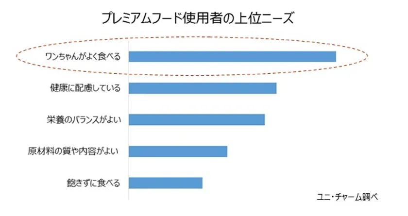 愛犬を家族の一員のように可愛がる意識が高まる中、飼い主様がペットフードを選ぶ基準も変化しています。中でも「ワンちゃんがよく食べてくれること」や「健康に配慮していること」「栄養バランスが良いこと」などが高いニーズとして存在しています。