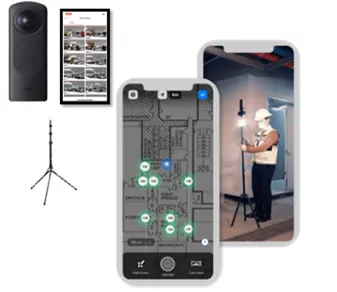 本サービスは、市販の360°カメラとスマートフォンにより簡単・即時に建物の3D-Viewを作成できるサービスです。