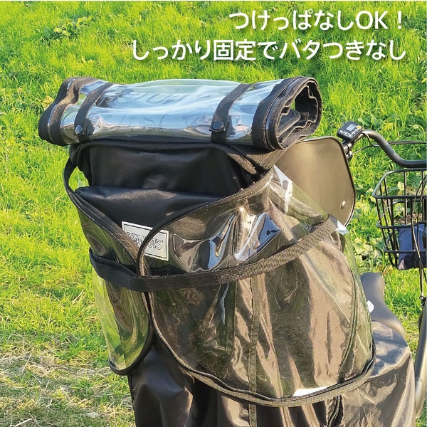 ・巻き上げてスナップボタン固定。両サイドのビニールをたたみ背面ベルトで固定することが可能。走行中にパタパタするのを防ぎます。