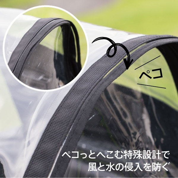 ファスナー(YKK製)をしめたあとに、サイドの窓が"ペコっ"とへこむ特殊設計だから、雨と風の侵入をしっかり防いでくれます。