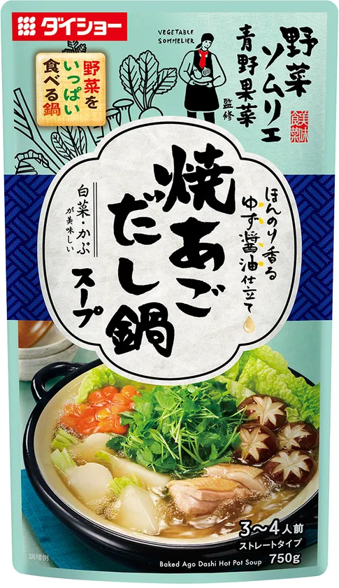 『野菜ソムリエ青野果菜監修 野菜をいっぱい食べる鍋 焼あごだし鍋スープ』は、厚みのある“だし感”と爽やかな“柑橘感”を合わせた鍋スープです。長崎県産焼あご(トビウオ)とはかた地どり、宗田節・カツオ節のだしを効かせた醤油仕立てのスープに、ゆず果汁がほのかに香ります。白菜、カブ、ニンジン、シイタケなどの野菜と鶏もも肉を上品な味わいで楽しめます。鍋あとには、焼いたお餅にスープをかけ、三つ葉を添えた「焼あごだし雑煮」がおすすめです。