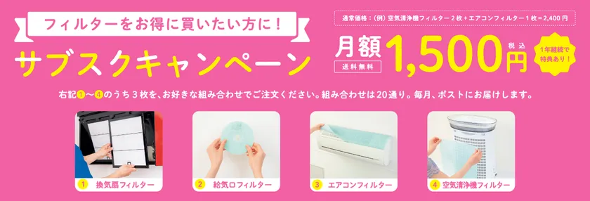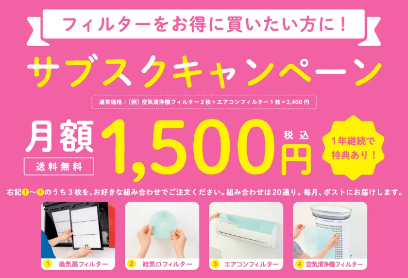 快適な空気をつくる暮らしをサポートする「空気の王様」のフィルターで、特に人気の4アイテムから毎月3枚をお送りします。組み合わせも20通りから選択できて、LINEで簡単にお申し込みが可能です。