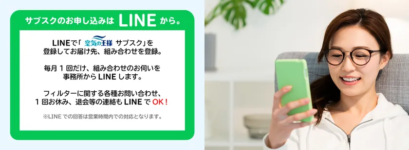 空気の王様のサブスクのポイントは、LINEで申し込みできることです。お客様の目線で徹底的に便利に、簡単に、を考え、LINEで簡単にできるように環境を整えました。