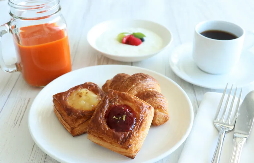 トースト(イングリッシュ、雑穀、レーズンから1種)またはモーニングペストリー盛り合わせ