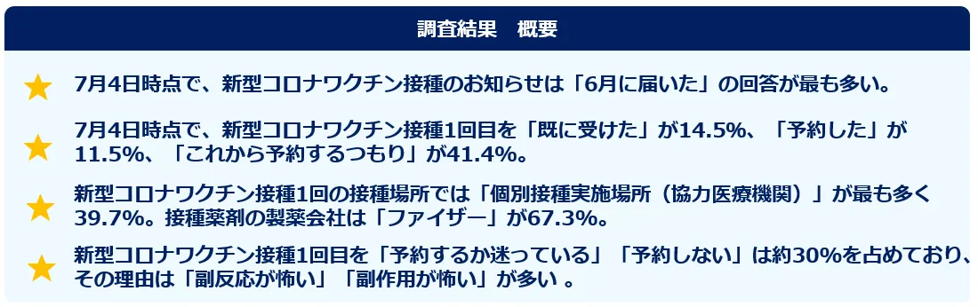 ■7月4日時点で、新型コロナワクチン接種1回目を「既に受けた」が14.5%、「予約した」が11.5%、「これから予約するつもり」が41.4%。
