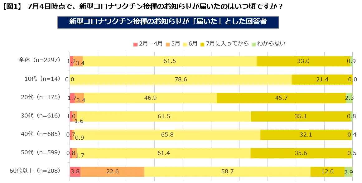1: 7月4日時点で、新型コロナワクチン接種のお知らせは「6月に届いた」の回答が最も多い。(図1)