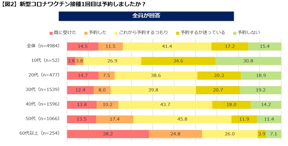 2:7月4日時点で、新型コロナワクチン接種1回目を「既に受けた」が14.5%、「予約した」が11.5%、「これから予約するつもり」が41.4%。(図2)