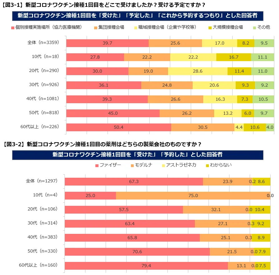 3:新型コロナワクチン接種1回の接種場所では「個別接種実施場所(協力医療機関)」が最も多く39.7%。接種薬剤の製薬会社は「ファイザー」が67.3%。(図3-1、図3-2)