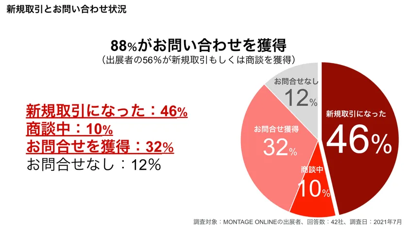 株式会社イーストフィールズ(所在地:東京都目黒区、代表取締役社長:東野 雅晴、以下 当社)が運営するオンライン展示会サービス「Granstra(グランストラ)」は、2021年2月1日~7月31日に開催した「MONTAGE ONLINE」の出展者へのアンケート調査を実施しました。その結果、出展者の約9割がオンライン上で問い合わせを獲得し、さらに半数以上の56%が新規取引を実現し、販路開拓に大きく貢献したことがわかりました。オンライン展示会はコロナ禍で注目される一方で、インテリアやファッション業界ではインターネットの活用が進まず、なかなか浸透してきませんでした。Granstraでは、オンライン展示会により中小企業のDXを支援し、販路開拓の一助となることを目指します。