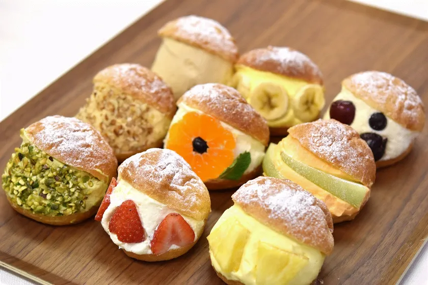 ピスタチオやブルーベリーの他、イチゴやメロンなどこちらも旬の果物ごとに合わせた風味豊かでカラフルな生クリームはフルーツの数だけ開発中。見た目も楽しいマリトッツオもご賞味下さい。
