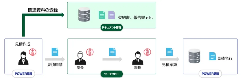 今回の機能強化では、「SMILE V ドキュメント管理」と連携することにより、見積作成と同時にスキャンした報告書など、関連する複数のファイルを登録することが可能になります。紐付けされたファイルは見積データから参照・編集ができるため、見積閲覧時に関連資料の確認や差し替えを行えます。見積書を起点に関連資料を一元管理することで、データを効率的に保管でき、業務の属人化防止にもつながります。