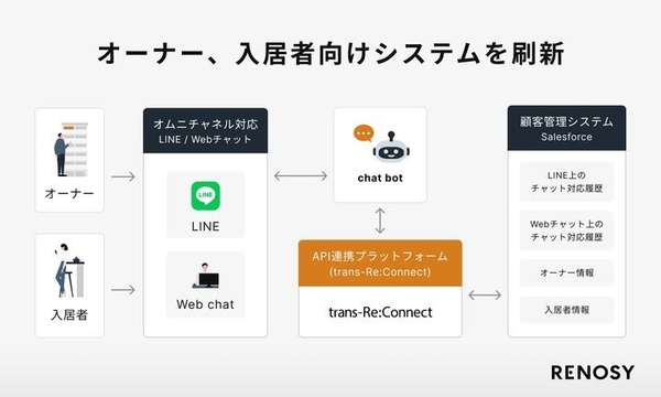 株式会社GA technologies[GAテクノロジーズ](本社:東京都港区、代表取締役 社⻑執⾏役員 CEO:樋⼝ ⿓、証券コード:3491)が運営するAI不動産投資サービス「RENOSY (リノシー)」は、トランスコスモス株式会社の提供するAPI連携プラットフォーム「trans-Re:Connect」を用いて、サービス顧客である“投資用不動産オーナー(以下、「オーナー」)”と“RENOSYが管理する物件にご入居中のお客様(以下、「入居者」)”の情報を一元管理し、その上で適切に、かつ即時に一次対応できる体制を構築しました。これにより、RENOSYが掲げるブランドコンセプト「安心・簡単・最適な、不動産による資産形成サービス」のさらなる実現を目指します。