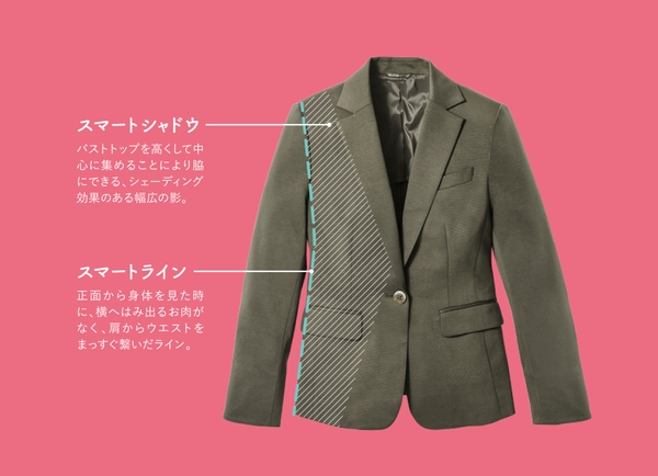 今回のコラボ企画では、働く女性が夏のビジネスウェアに求める機能性を取り入れたジャケット・パンツ・ワンピースの3アイテムを展開します。ジャケットの内側には、あると便利な「マスクホルダー」を取付け、食事の際など置く場所に困るマスクを簡単に出し入れができます。また、UVカット機能を備えた背中の裏地を立ち上げて「ネックカバー」にすることで、気になる首元の日焼け対策としても着用いただけます。さらに、ポケットティッシュやウェットシートを入れることができるポケットや深めのオープンポケットを設置し、わざわざポーチを持たずに必要な小物をジャケットに収納できます。
