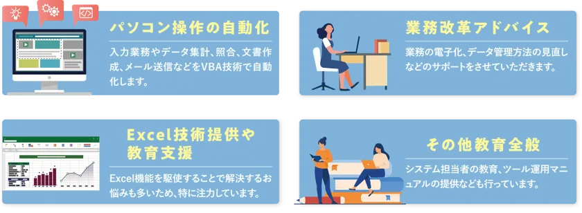 働き方の見直しが必須となっている昨今、定型業務の自動化を図ることで生産性の向上や作業時間の削減を実現する「業務自動化支援事業」を2021年9月1日より新たに開始いたします。業務自動化で有名な「RPA(※1)」と呼ばれる技術ではなく、従来の「VBA(※2)」と呼ばれる技術で業務効率化を支援いたします。VBAでの業務効率化は、ExcelやWordといったこれまで使用しているソフトウェアの使い勝手はそのままに導入することが可能なので、導入後すぐに運用することが可能です。維持費もOffice製品のライセンス費用だけなので、純粋に開発費用だけで導入できることも魅力です。