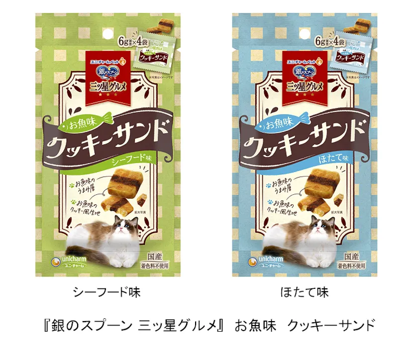 ユニ・チャーム株式会社(代表取締役 社長執行役員:高原豪久)は、ご好評の猫用ドライおやつの『銀のスプーン三ッ星グルメ』お魚味クッキーサンドから、「味や食感をもっと楽しみたい」という声にお応えし、シーフード味とほたて味を2021年9月27日に全国で新発売します。