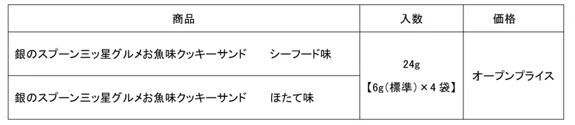 そこで、このたび、このようなお客様の声にお応えして、『銀のスプーン三ッ星グルメ』お魚味クッキーサンドからシーフード味とほたて味を全国で新発売します。