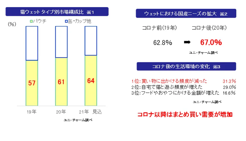 猫ウェットフード市場において、パウチタイプの構成比が年々増加※1しており、コロナ前とコロナ後の比較では、ウェットフードに対する“国産”ニーズが高まっています※2。また、コロナ以降の生活意識の変化として、まとめ買い需要が増加※3しています。