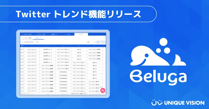 ユニークビジョン株式会社(所在地:東京都新宿区、代表取締役社長:白土` 良之 以下、ユニークビジョン)は、当社が提供するSNS統合管理ツール『Beluga』にTwitterトレンドを検索・ダウンロードできる新機能を追加したことを報告いたします。