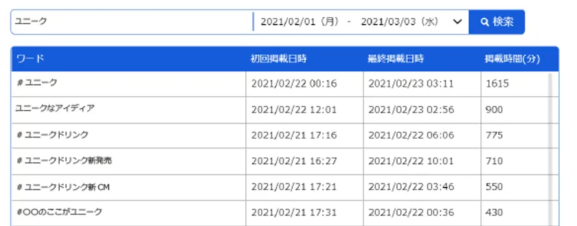 自社や競合企業に関連した気になる/調べたいキーワード(商品名やキャンペーンハッシュタグなど)が、指定期間にトレンド入りしていたかどうかを検索して表示することができます。