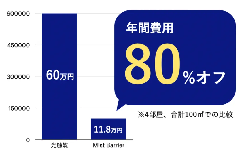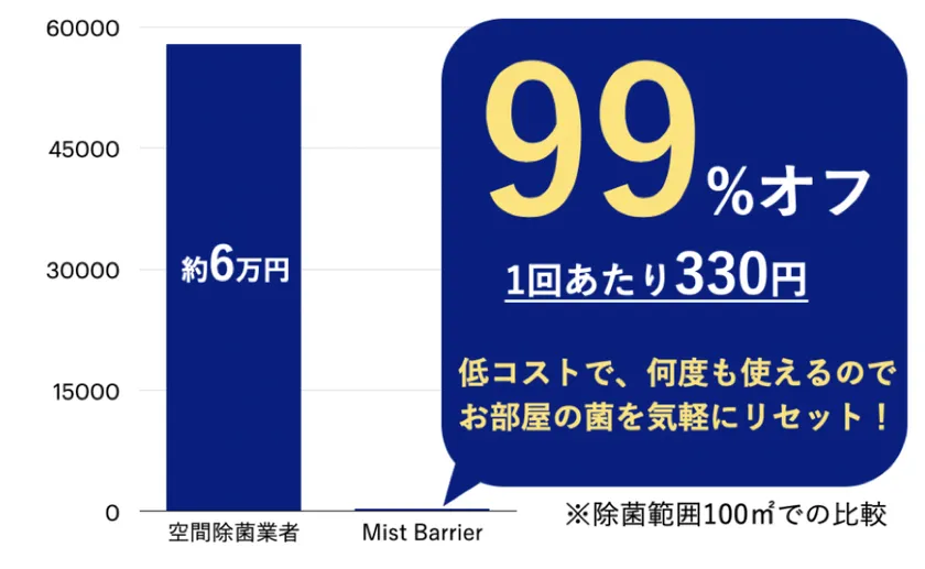 Mist Barrierは、空間除菌業者に比べ、1回あたりのコストが99%オフを実現しました。