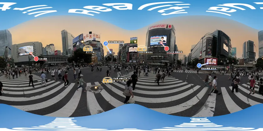 ※サンプルは、メニューへ戻る設定ですが、ストリートビューのように次々へと移動や360度動画で移動の動画なども可。