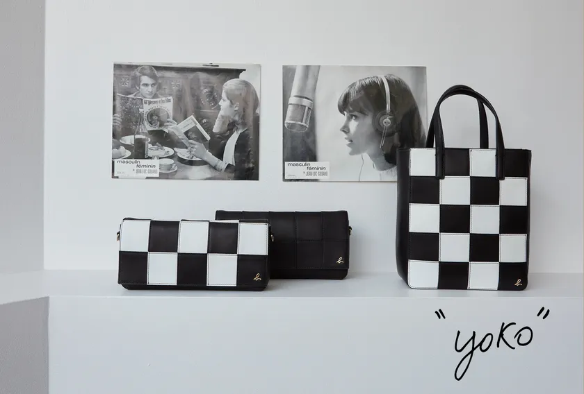 白黒のコントラストが印象的な“yoko”は、スタイリッシュなスクエア型のトートバッグとカクテルバッグの2型で登場。カクテルバッグは、アニエスベー自身がカンヌ映画祭へもっていくほどお気に入りのシェイプです。思いっきりフェミニンになりがちなスタイルに、チェックのようなパターンでアニエスベーらしいロックの要素をピリッとアクセントに効かせました。トートバッグは、秋を感じるカラーバリエーションも展開。