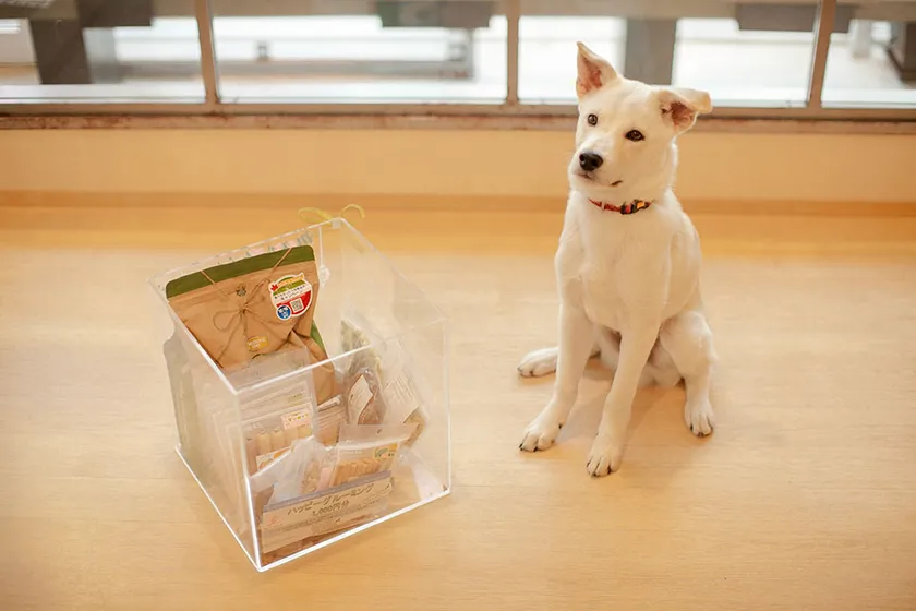 「自分は里親にはなれないけれど、保護犬たちのサポートしたい」と願うお客様が、愛犬のためのお買いもののついでに保護犬たちにプレゼントを贈れる仕組みを設けました。プレゼント(寄付)したい商品を専用ボックスに入れていただくだけで保護犬たちのサポートができます。