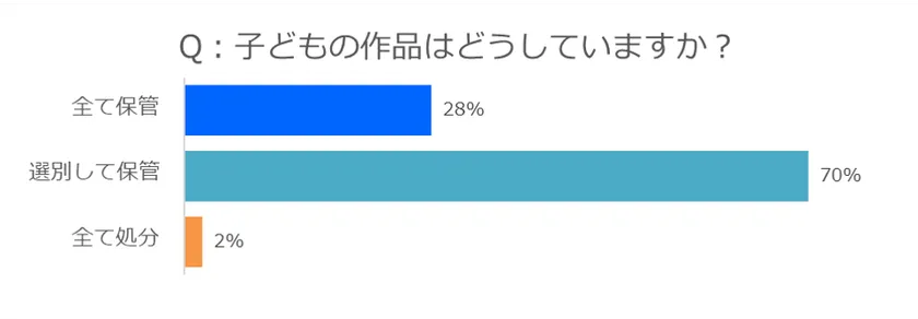 また、子どもの作品は、選別もしくは全て保管している方が9割、全て処分が2割と、ほとんどの方が捨てられずに保管しているということがわかりました。