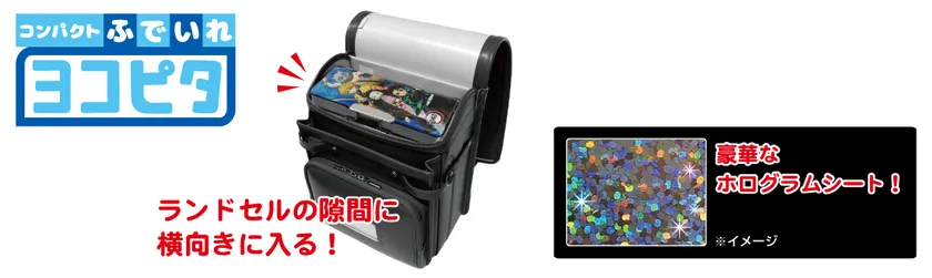 累計出荷125万個突破の「ヨコピタ」シリーズは、ランドセルの隙間に横向きに入るふでいれです。子どもの小さい手でも持ちやすく、荷物が多い日にもかさばらずに安心です。小学生向けふでいれの人気調査でNo.1(※)を獲得しました。それぞれのキャラクターデザインにも注目です!