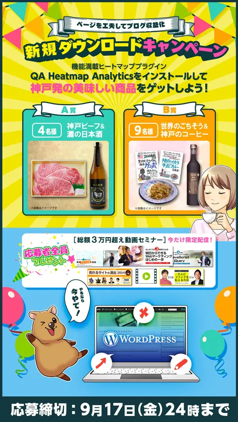 株式会社ウェブジョブズ(本社:兵庫県神戸市、代表取締役:丸山 耕二)は、WordPressの無料プラグインとして提供しているユーザー行動解析ツール「QA Heatmap Analytics」のマスコットキャラクター「くーすけ」誕生を記念し、応募いただいた方に豪華プレゼントが当たるキャンペーンを2021年8月17日(火)~9月17日(金)まで実施いたします。
