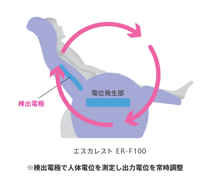 エスカレスト ER-F100は検出電極を背もたれに設置し、人体電位が常にフィードバックされることで、いつでも、どんなときでも周辺環境に左右されない電位治療が実現しました。