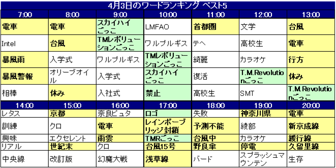図2.4月3日のワードランキング 1時間毎推移
