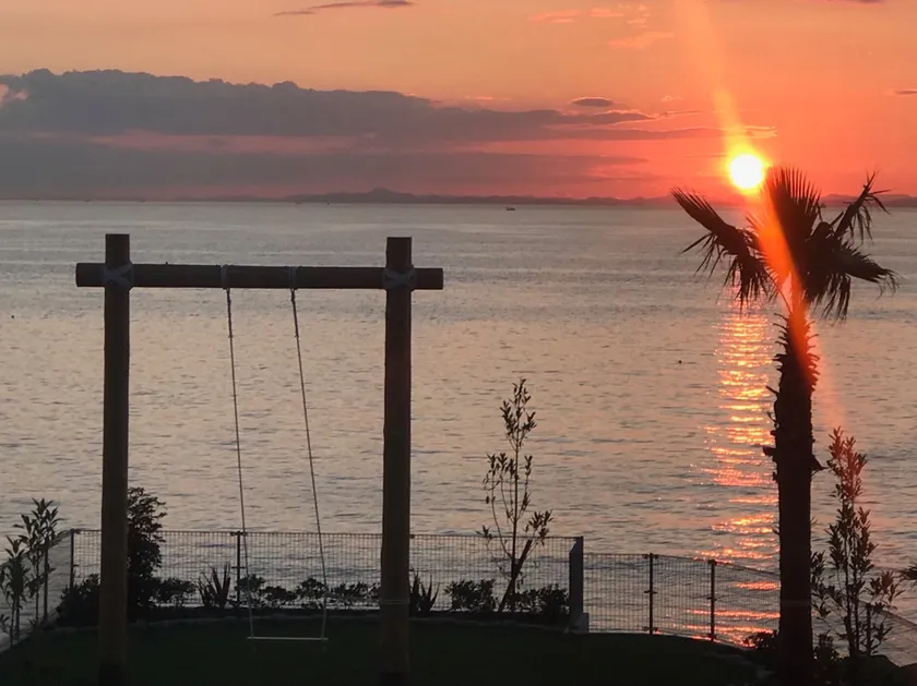 穏やかな瀬戸内海に面しており、昼はリゾート感あふれる美しいマリンブルー、水平線に沈む夕日は日本の夕陽百選にも選ばれるほどの美しさです。