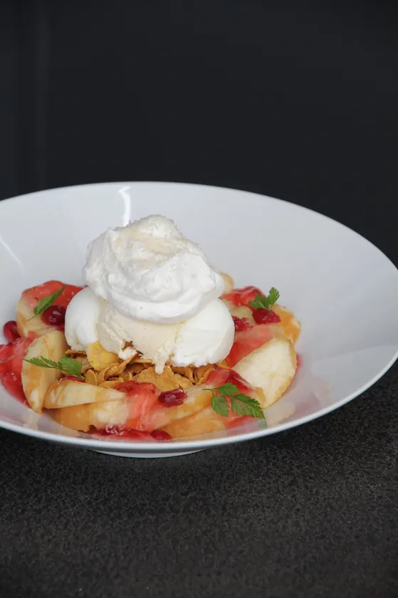 通常細長いグラスにコーンフレーク・フルーツ・アイスクリーム・ホイップクリームなどを重ねて盛り付けられるパフェに比べ、幸せのパンケーキの『皿パフェ』は大皿にボリューム満点に盛り付けております。