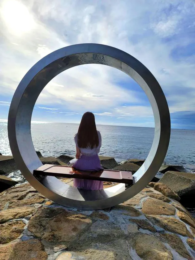 青い海と青空に映える大きな丸太のブランコが目印。