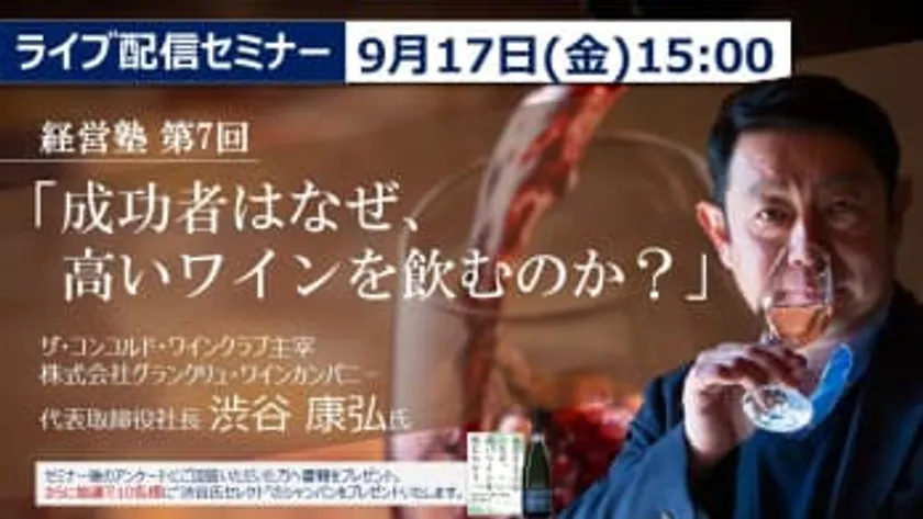 経営塾 第7回「成功者はなぜ、高いワインを飲むのか?」 オンラインセミナーが9月17日(金)に開催 グランクリュ・ワインカンパニー代表 渋谷 康弘が講演