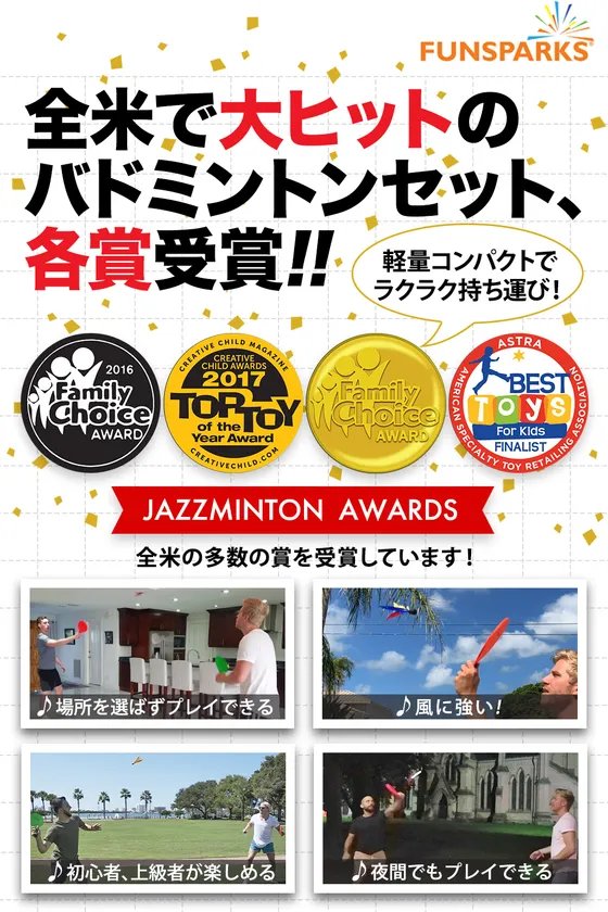 全米大ヒット&多数のおもちゃ賞受賞! ネット不要ですぐに遊べるバドミントンセット 卓球&テニスもできる「ジャズミントン」日本正式販売開始!