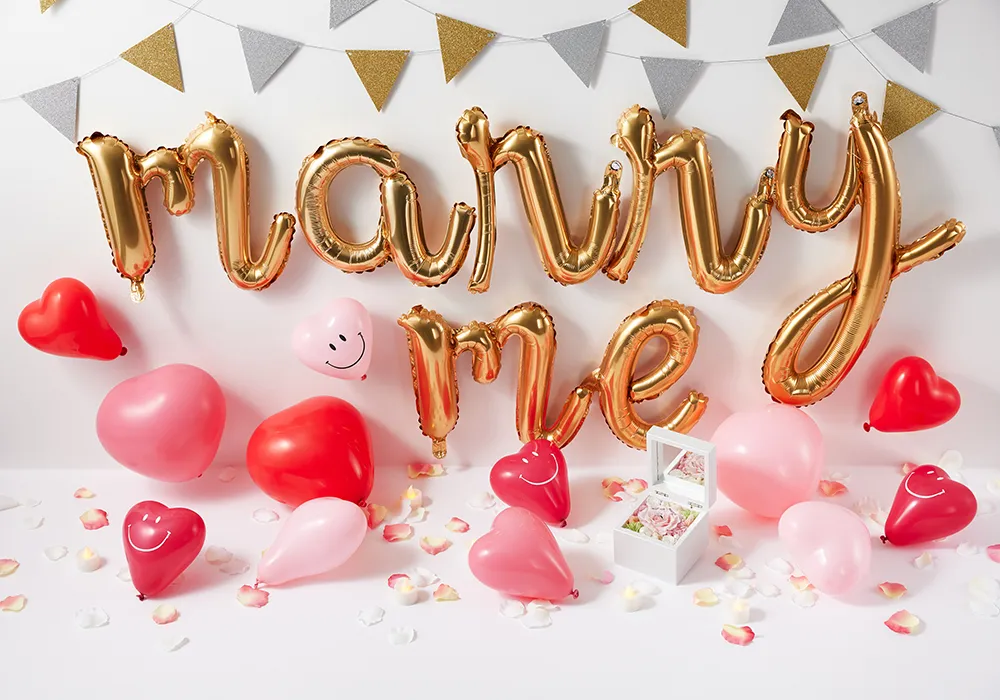 自宅やホテルのお部屋で、プロポーズを考えている方にお勧めする、ハートバルーンにお花をいっぱいに敷き詰めた人気のオルゴールボックスが付いたオリジナルセットです。曲は「Marry me」他、2曲からお選びいただけます。思わず写真が撮りたくなるような愛が溢れる装飾と共にプロポーズを盛り上げます。