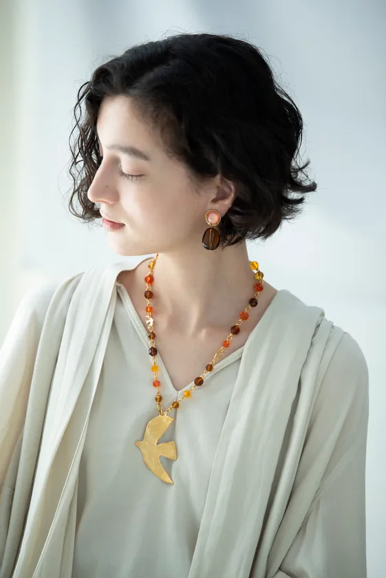 ブランドのシンボルである鳩のチャームが胸元にはばたくハンドメイドのペンダント。