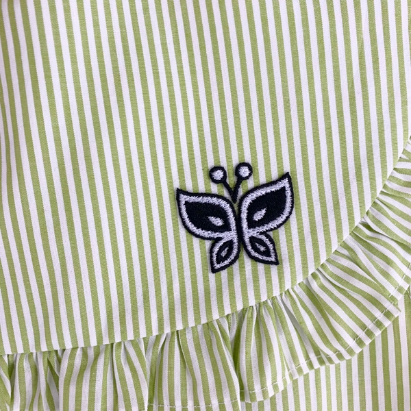 ドレスは、フリルをあしらった大きな衿に花を、後ろにはチョウのモチーフを配し、可愛らしくも大人っぽく仕上げました。スカート部分は、裏側にオーガンジーを重ねてギャザーをたっぷり寄せ、女の子らしくふんわりとした優しいシルエットにしました。