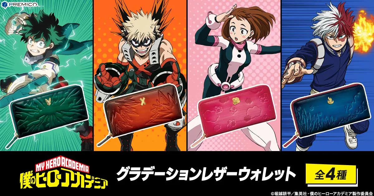 TVアニメ『僕のヒーローアカデミア』より、緑谷出久・爆豪勝己・ 麗日お茶子・轟焦凍をイメージしたグラフィカルな革財布が登場! プレミコから販売開始