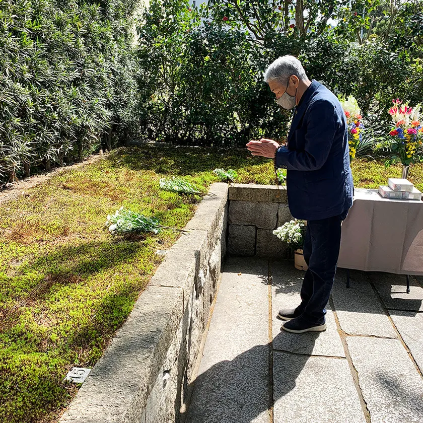 お参りしたくても感染を拡大させてはいけない、でもご先祖さまへの感謝の気持ちは大切にしたい、そのような方のためにオンラインにてお参りしていただけるよう、墓前での法要のあと、緑雲会を代表して幹事による焼香と献花の様子も配信いたします。