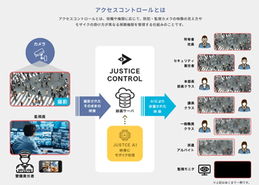 当社の「JUSTICE CONTROL」は、AIによる映像管理並びに閲覧権限及び操作ログの徹底した管理によって、監視映像がプライバシー侵害の道具となる事態を防止し、より厳格化が進む個人情報保護法に準拠した運用が可能なシステムです。