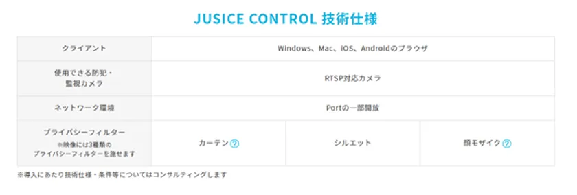 JUSTICE CONTROLは、以下の3つの機能から構成されるシステムで、PC、iOS及びAndroidのブラウザで使用できます。当社製のカメラ以外でも、ネットワーク対応型のカメラであれば(※)、JUSTICE CONTROLを利用でき、設置済みの既存の防犯・監視カメラにも導入が可能です。