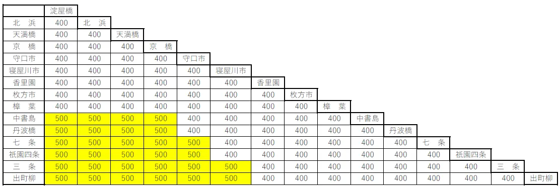※定期券の場合、「大江橋駅」「淀屋橋駅」のどちらか一方をご利用いただける定期券であれば、もう一方の 駅でも乗り降りができます。同じく、「なにわ橋駅」「北浜駅」のどちらか一方をご利用いただける定期券であれば、もう一方の駅でも乗り降りができます。PiTaPa区間指定割引は定期券と異なり、登録区間については上記のような特例は適用いたしません。
