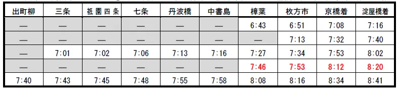 ご利用状況に応じた運転本数に変更します。朝夕ラッシュ時間帯の運転本数を見直すほか、昼間時間帯(10時~15時台頃)は、各列車種別を1時間あたり上下それぞれ4本(現行6本)に加え、淀屋橋ー出町柳間に「プレミアムカー」を連結した快速急行を1時間あたり上下それぞれ2本運転します。また、最終列車の運転時刻を20分程度繰り上げます。