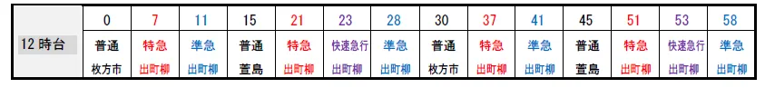(1)昼間時間帯(10時~15時台)の1時間あたりの特急、準急、普通(中之島ー萱島・枚方市)を上下各6本から4本運転(概ね15分間隔)に変更し、新たに快速急行を2本運転(概ね30分間隔)します。