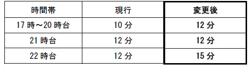 (1)深夜時間帯の上下合わせた運転本数を平日は56本→38本に、土休日は53本→37本に変更します。